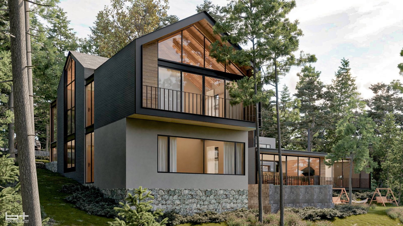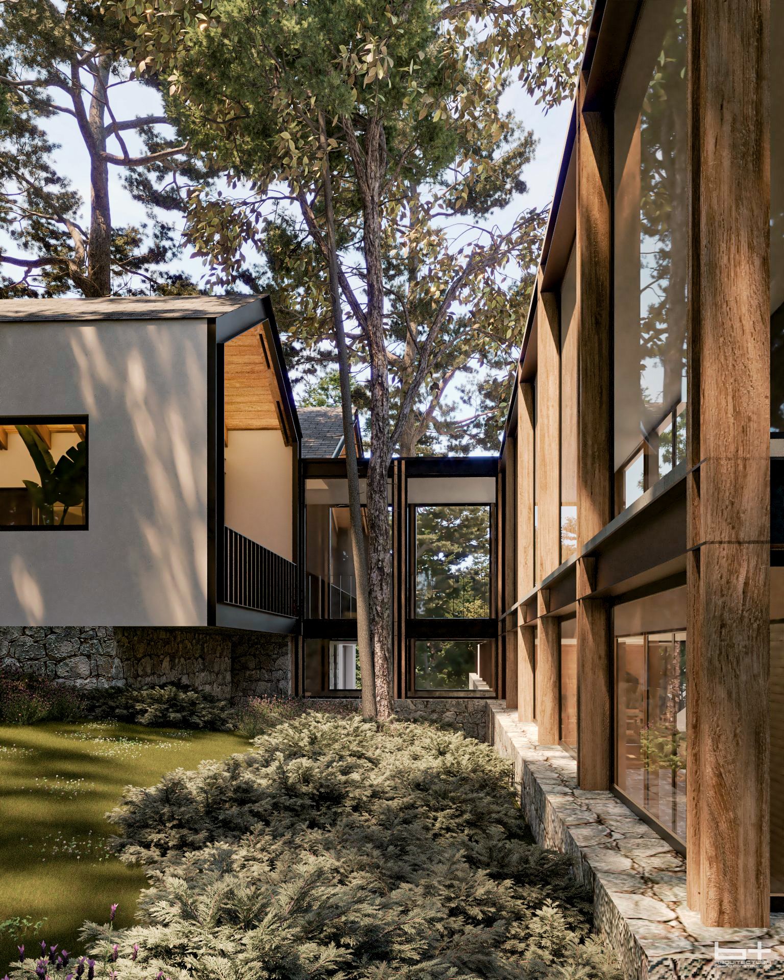 Entre dos muros de piedra natural, la construcción se levanta para crear un espacio íntimo en dónde la intimidad y le bosque se cuentan secretos a voces.
