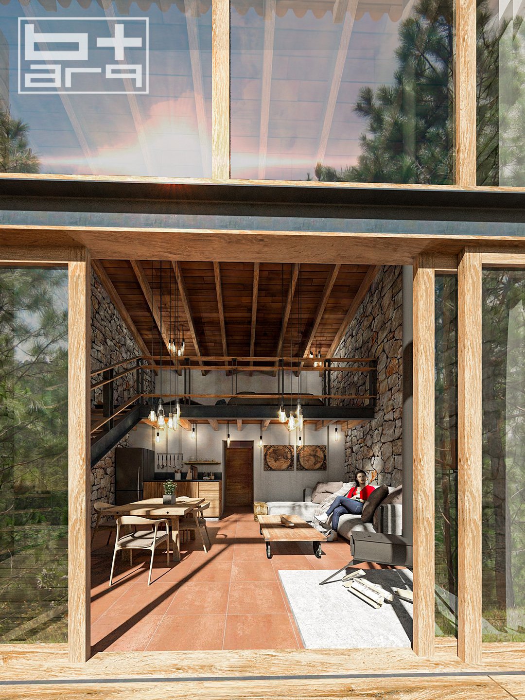 Con un área de 50mts de desplante, se realizó una habitación estudio donde cualquier pareja se pueda sentir mimetizada en el bosque. Los ventanales altos hacen la simbiosis entre el interior y el exterior, teniendo una sola visual hacia el bosque, el ocaso, y el amanecer.